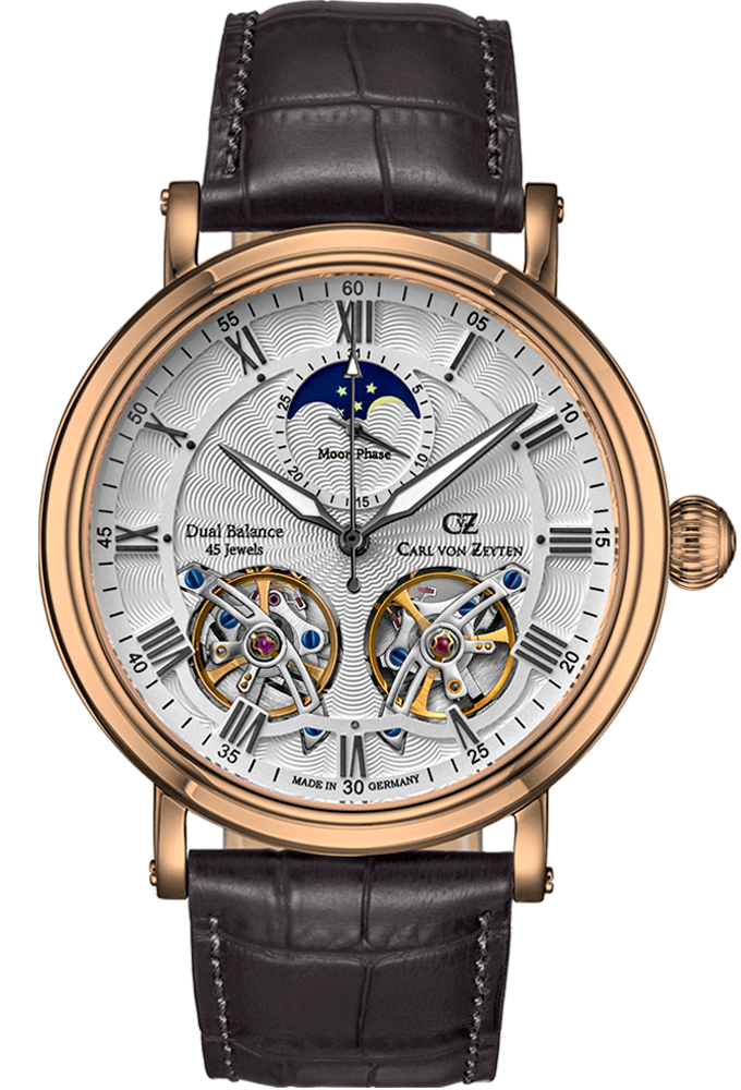 Автоматические часы с двумя открытыми балансами на 6 часах. Функции: часы, минуты, секунды, дата и фазы луны. Корпус из нержавеющей стали 316L. Сапфировое стекло. Серебристый циферблат с гильоше. Вороненые стрелки и винты. Ремень из кожи теленка.